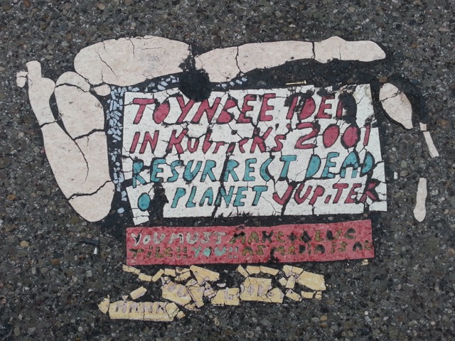 It doesn’t get much more “street art” than the mystery “Toynbee Tiles” that have appeared embedded in the macadam of city streets throughout the country (and the world!) for the last several decades. They’ve been tracked pretty thoroughly and their story and the search for their creator was spellbindingly told in the terrific documentary film Resurrect Dead (2011).
