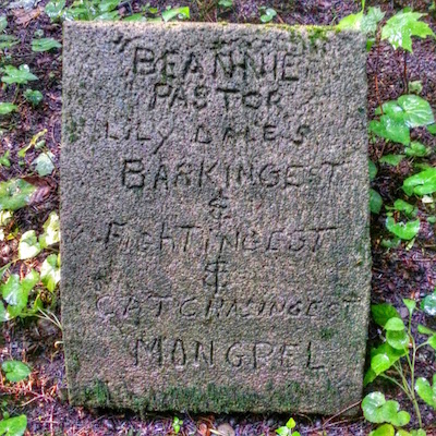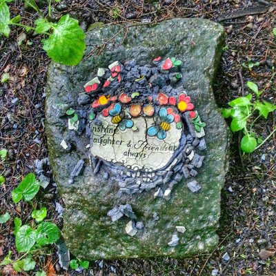 This was The Orbit‘s first trip to a legit pet cemetery, but hopefully not our last–we’re hooked! Lily Dale’s goes way back. The earliest dated stone we saw was from 1920, but I got the sense it was considerably older than that. There are hundreds of graves in the small forest clearing where the cemetery stands. The markers range from professional chiseled stones with names, dates, and epitaphs, to crumbling homemade crosses, sculptures, cast concrete, and painted rocks.