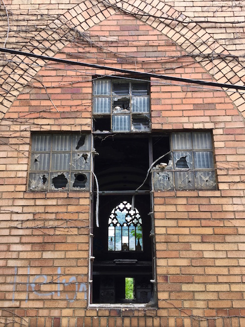 exterior of former Holy Trinity Catholic church, Duquesne, PA missing windows and trees growing over front steps