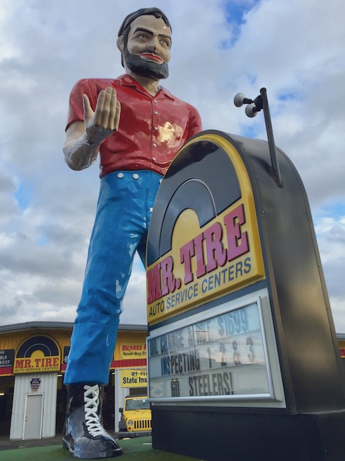 There we were–Mrs. The Orbit and her fella–heading to Our Nation’s Capital to defend Democracy. You’re welcome. But with a few extra ticks on the clock and taking any excuse to avoid the turnpike, we opted for the slightly longer trajectory via Rt. 51 and had a chance to check in with Mr. Tire himself in his home base in Uniontown.