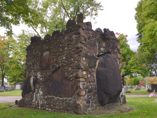Instead, the monument has clearly been constructed by hand, from an oddball collection of irregular stones. These range from the size of a cantaloupe to huge boulders that would crush a house in their falling path. One of these massive rocks has been set to entirely block the front entrance to the tomb, leaving only an oxidized copper Leaf nameplate visible awkwardly above. Water-smoothed river pebbles have been used to create decorative features within the mortar walls and vertically-places stones sit on top to resemble crude castle battlements.