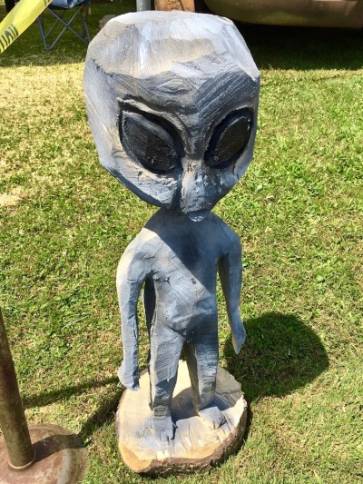 The best of the lot were a number of artisans who brought chainsaw-hewn sculptures of big-eyed aliens and models of Big Foot. (Big Feet?) Among the latter were some extremely impressive life-size (around 7-feet tall) carved-from-a-tree-trunk Sasquatches–any one of which would look great in the backyard of Chez Orbit.
