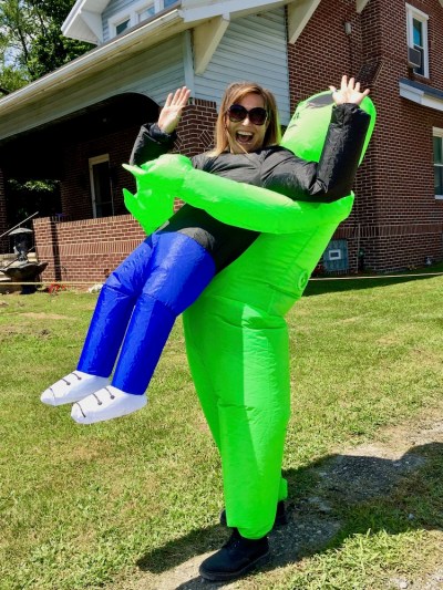 Of course, not every attendee of the Kecksburg UFO Festival takes the event quite so seriously. The costume du jour was clearly this one that effectively makes the illusion an alien is hoisting a child-sized version of the person within (see photos above and below). After seeing a bunch of these–both at the event and then reviewing the pictures afterward–I can tell you neither is the deception obvious nor does the joke get old.