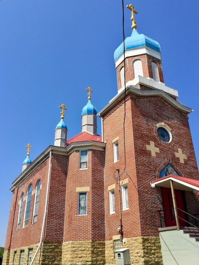 The same can’t be said for Saints Cyril and Methodius. The eponymous brick Russian Orthodox church constructed in their honor decorates the absolute peak of Scott Avenue on the north side of town. The building’s distinct roofline, featuring multiple sky blue-with-gold crosses, is visible from just about anywhere in the city.