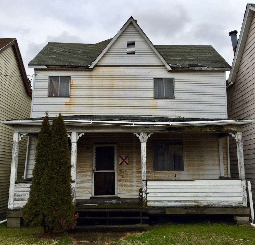 In other places, you might see official Condemned paperwork stapled to the front of a “dead building standing” or maybe there’s no warning at all–one day it’s there; the next there’s a pile of rubble. But in New Kensington, derelict buildings are literally marked as living on borrowed time with a big red X crudely painted across a white square of plywood nailed to the front door.