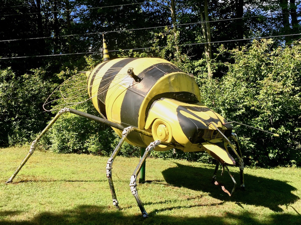 The big bee is a work of art living in the green grass of a large private yard. Its head is made from the fore-section of an old Saab; the thorax looks like the tumbler from a cement mixer. Spindly legs, delicate wings, and all the insect’s other features have been similarly fashioned from junkyard effluvia. It’s one of a dozen or so works at Schaefer’s Auto Art.
