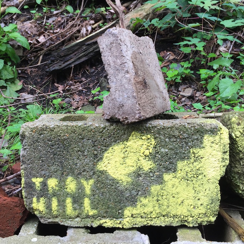 cinderblock with stencil image of pig climbing stair steps and text "Troy Hill," Pittsburgh, PA