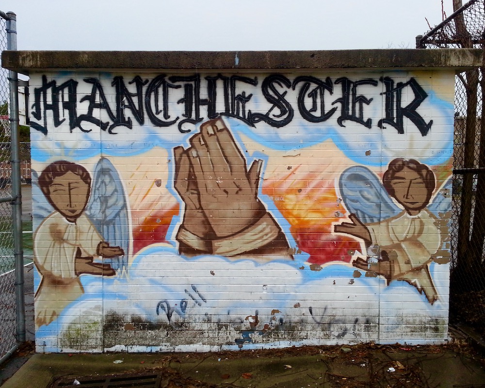 mural for Manchester neighborhood of Pittsburgh including praying hands and angels