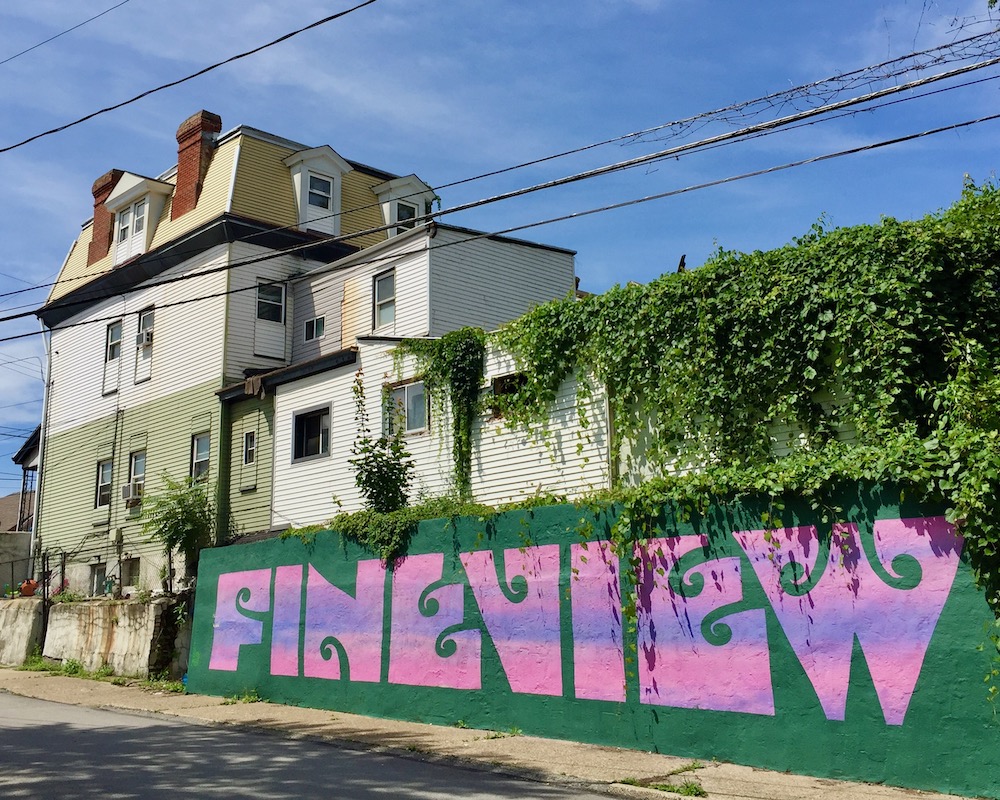 neighborhood welcome sign for Fineview, Pittsburgh painted on retaining wall
