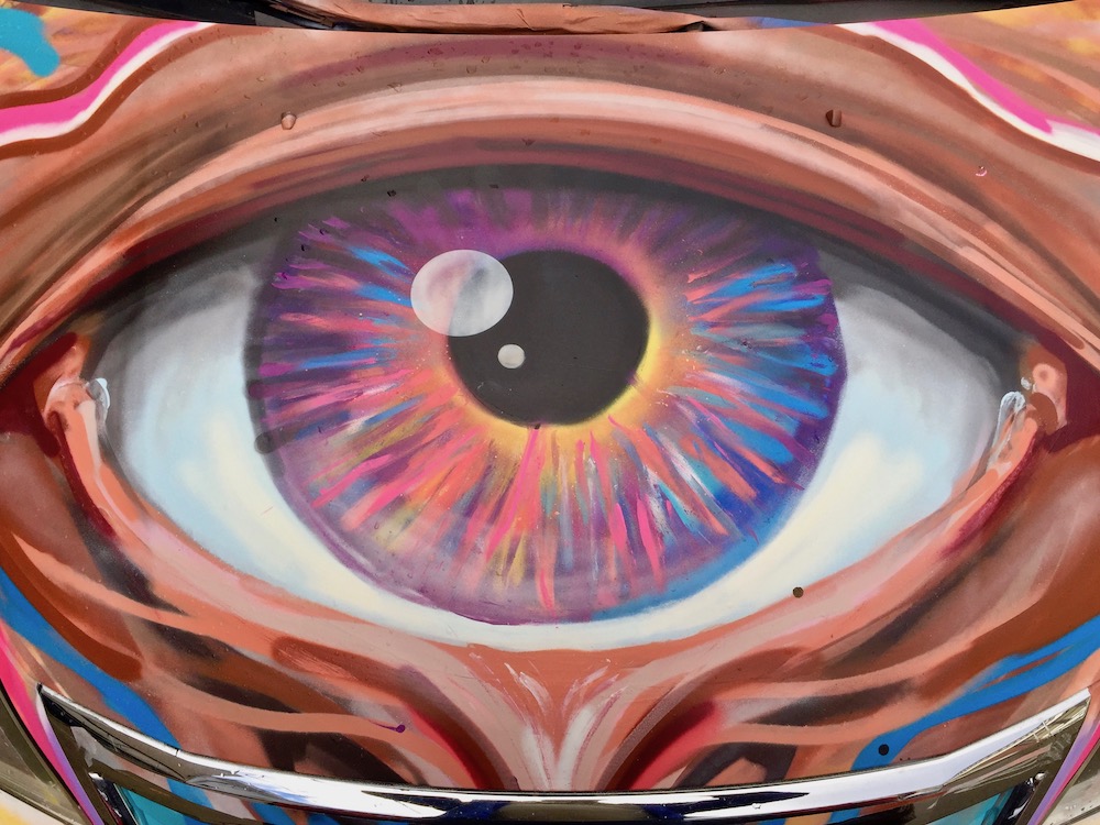 Here’s lookin’ at you. The big eye on the hood of the Red Fish Bowl art van in Lawrenceville. One of many fine examples of artworks created for the engine hoods of automobiles.