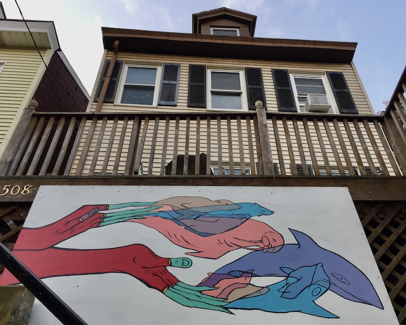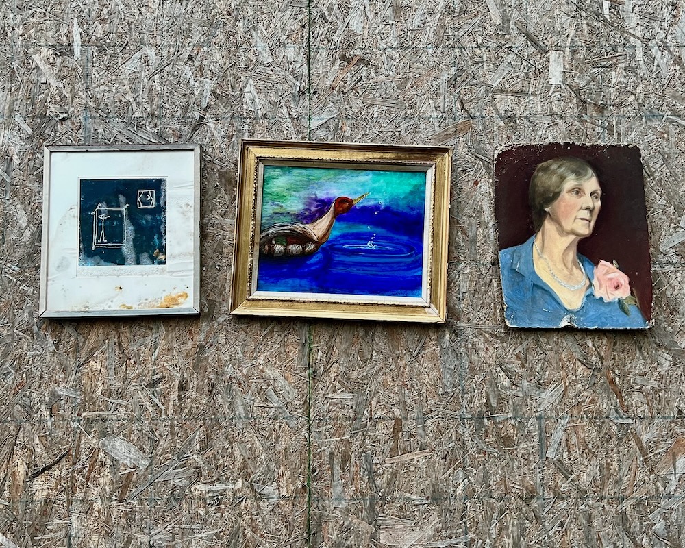 Across two faces of an ever-under-construction house in Millvale is a rotating gallery of both discarded / repurposed / found artwork and original, site-specific pieces attached directly to the exterior plywood of the would-be home. It’d be an odd thing to come across anywhere, but here on this side of a side street, up the hill from down, on an out-of-the-way dead-end seems particularly unlikely.