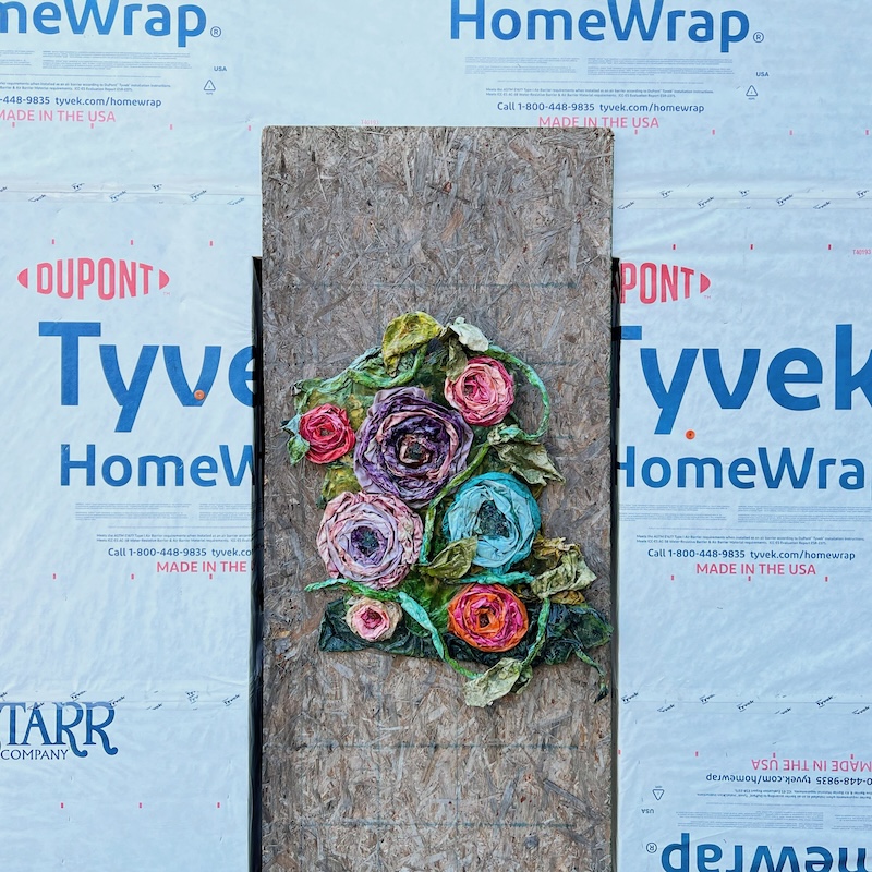 Speers describes a fence collaboration she did with artist friend Judy Manion of a giant knitted American flag. Manion created the flag with falling bars and stars in response to 9/11 and installed it on the fence in 2014. “The wind, the rain, and temperature changes started to do funny things to the flag, so I took it off and laid it on the deck and rearranged it.” The deteriorated and rearranged flag was entered into a juried art show. Speers then returned the flag to the fence, letting it decompose further. This later iteration was also exhibited professionally.