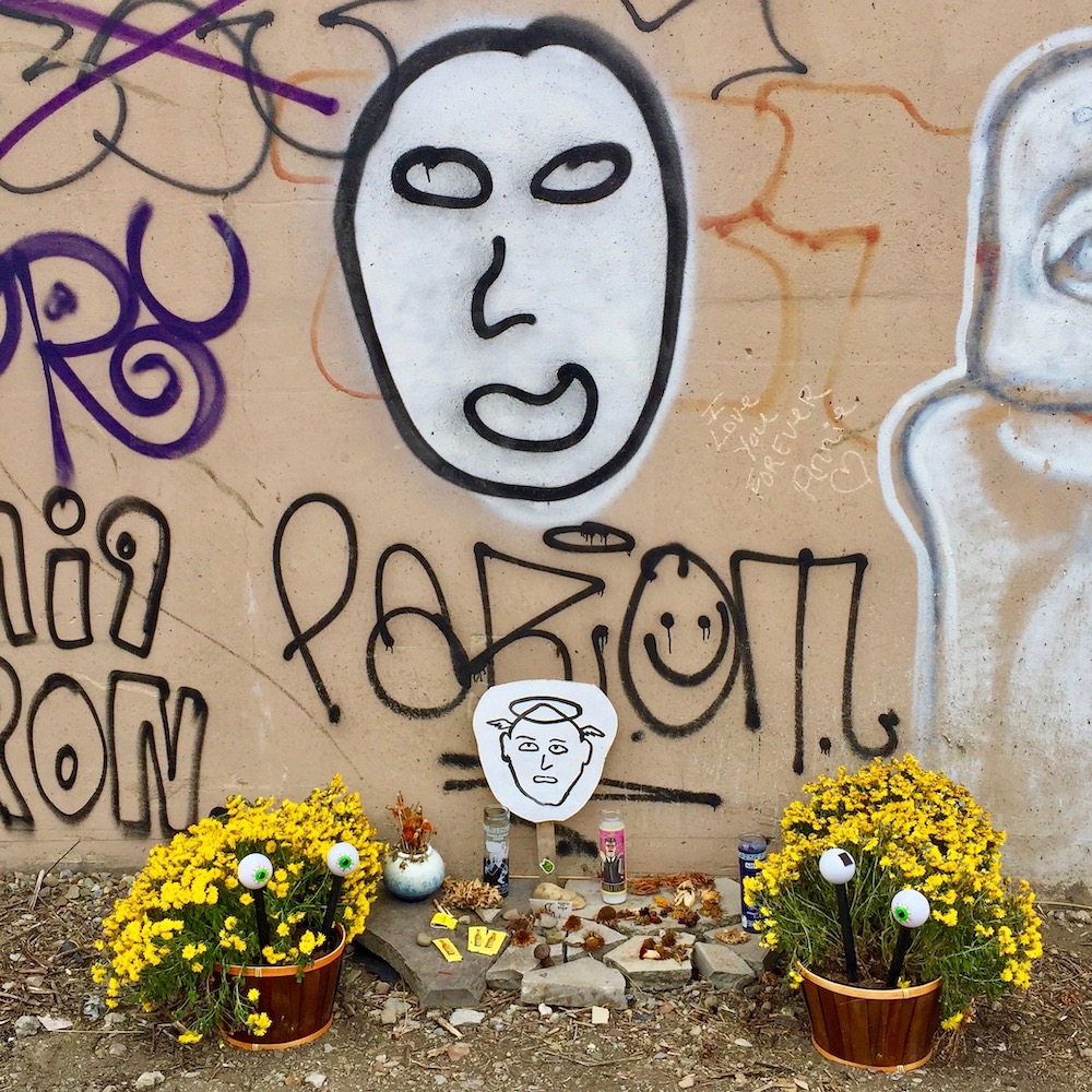 On an otherwise unremarkable side street, a single roadside tree stands out from the rest. Attached to it is a bouquet of pink and white flowers, a solar-powered light, and enlarged color photograph of a young man. The subject is both movie star handsome and ruggedly everyman in his plain white t-shirt and stretchy track suit pants. Aside from the man’s face, every square inch of exposed skin has been tattoo’d in an array of text, glyphs, and images.