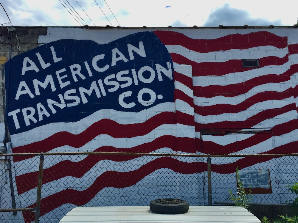 All American Transmission, inhabiting a cinderblock garage just off Millvale’s main drag, has been on our list for as long as we’ve been collecting stars and bars. The giant flapping American flag painted across the shop’s north-facing side wall is what this Independence Day series is all about–created by hand, patriotic, but maybe a little bit … off.