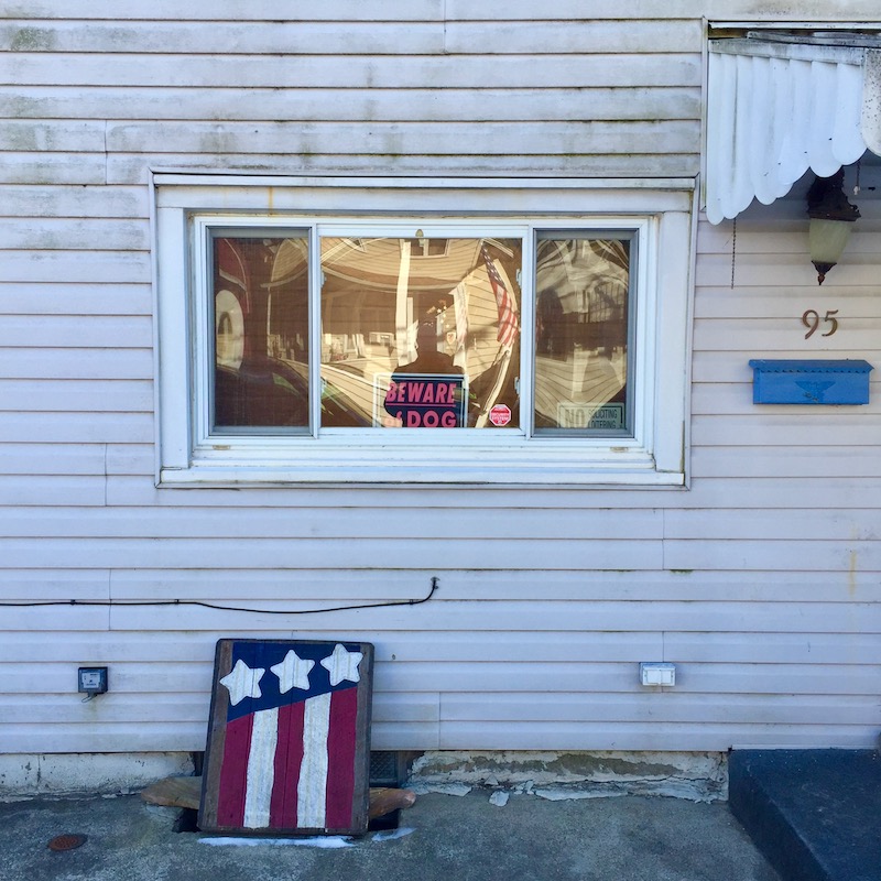 A row house in Polish Hill with pale blue aluminum siding covered in viny overgrowth with American flags as window curtain and mailbox ornament. Sunshine spotlighting Old Glory suspended from a makeshift carboard-covered windowpane against a blue-gray staircase. A fishing boat, its nose pointed skyward, decorated like an American flag (but missing the stars) photographed so early on an overcast morning the entire frame is in a still-dreaming blue pallor.