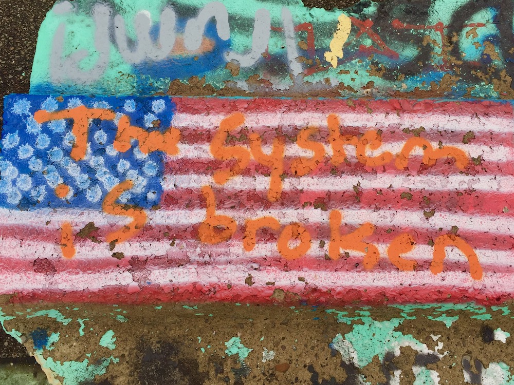 “The system is broken.” Graffiti flag, Color Park, South Side