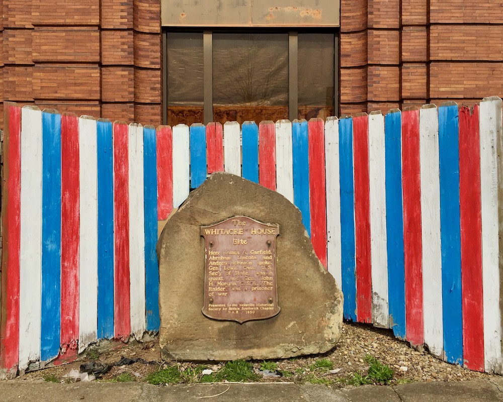 “The guy who painted that died before he could finish the face.” Faceless Statue of Liberty flag bench (detail), Vandergrift