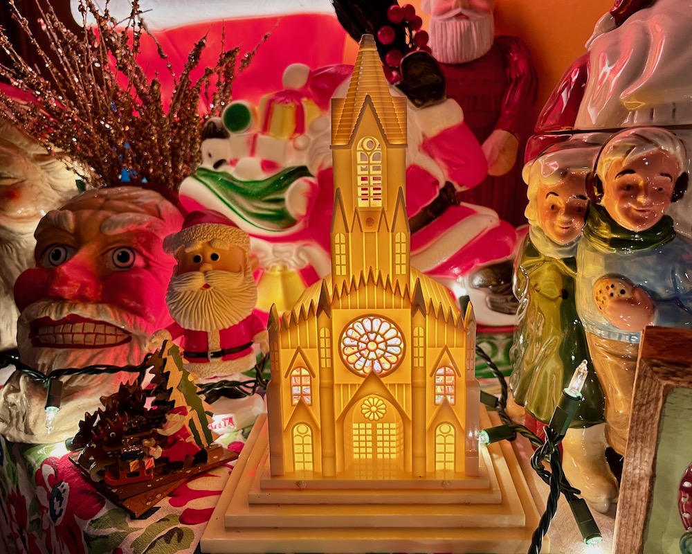 The collecting bug began some forty years ago with a particular figure found at a long-gone Carson Street antique shop. That wind-up Santa, made of molded tin in 1960s Japan, moved in elaborate head-turning, arm-oscillating ways. Paul gave the original to his sister when he recently acquired a superior edition that included the original Merry Xmas sign. [See photo at top.]