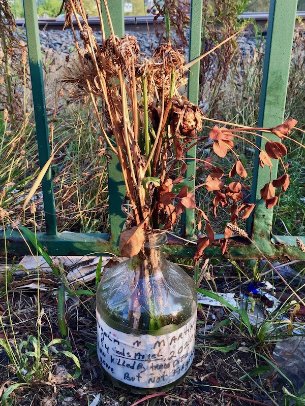 Sometimes we get a name, or names, but that’s it. Who were Tony, Bette & Sisters? (photo above) And how did they come to be memorialized with flowers and a placard on the concrete support of the Homestead High-Level Bridge? Did this fairly anonymous spot have a special significance to their lives? Their passing?