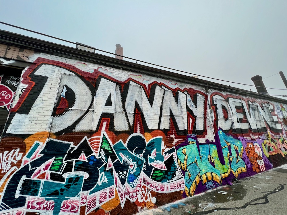 As many times as we tried, the big mural was never available for a proper photo shoot. Inevitably, either the surrounding chain link fence would be locked tight or vehicles were parked in the lot such that we could never get a clean angle on the wall.