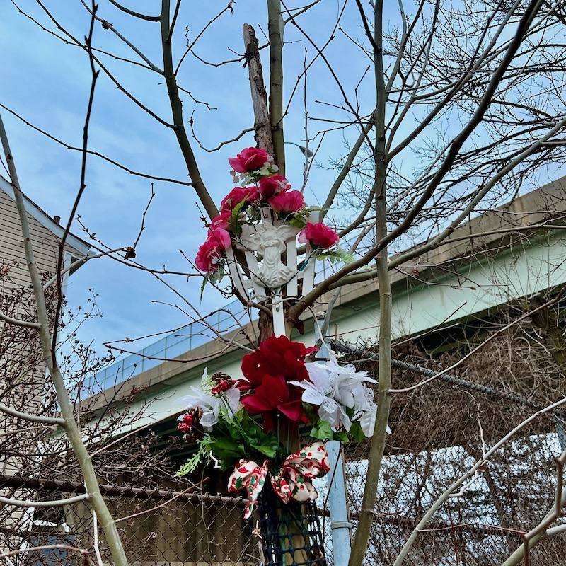 Of course we can’t know for sure—there is no annotation for the beribboned photo on this back-alley tree—but by now, we’re accustomed to think of these informal tributes as memorials for lost friends, loved-ones, or community members who’ve passed onto the infinite entirely too soon for those who mourn them here on earth.