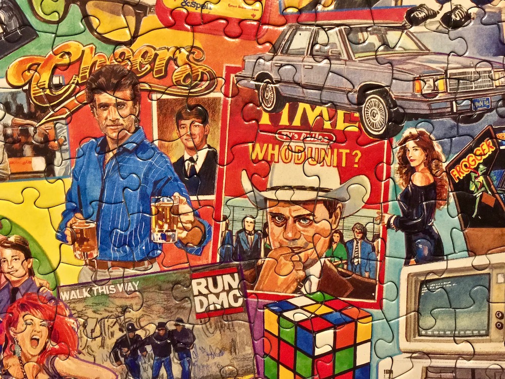That’s true, at least, if you’re solely going by The Eighties, a 1000-piece jigsaw puzzle whose artwork is a hand-illustrated collage of some hundred-plus pop culture references from the period. There, sandwiched between Sam Malone from Cheers, the Chrysler K-Car, and Time magazine’s Whodunit? (aka “Who shot J.R.?”) cover, is a young Jim Mellett, dressed up in a jacket and tie for his high school yearbook photo.