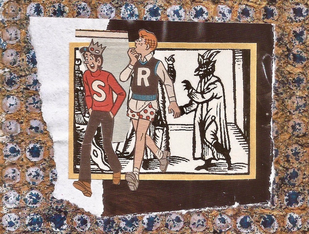 Draped atop the figure is surreal cloak in another raft of deep reds. The head of a hound—looking very much alive, minus its lower jaw—with attached forelimbs morphs into a full body covering.