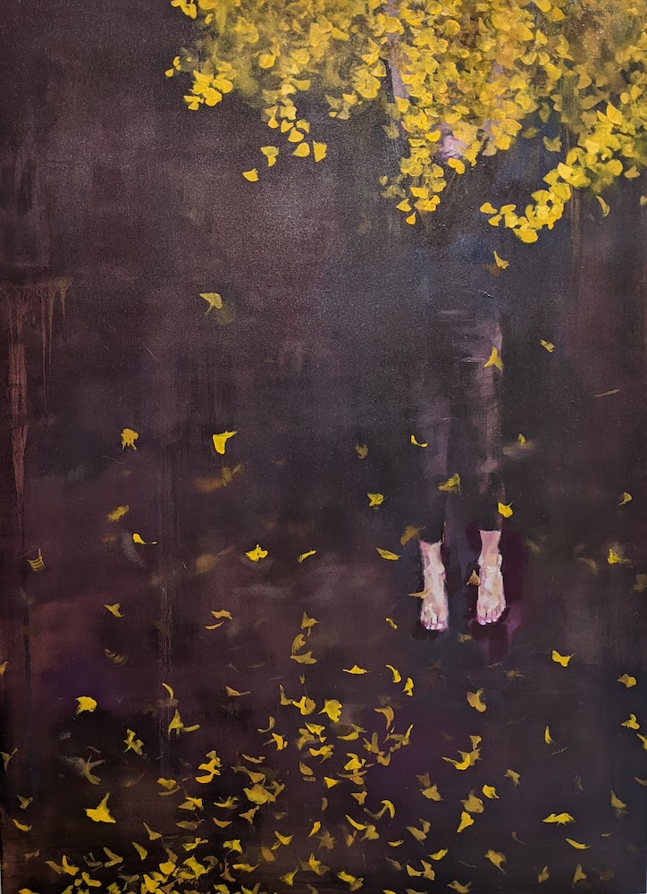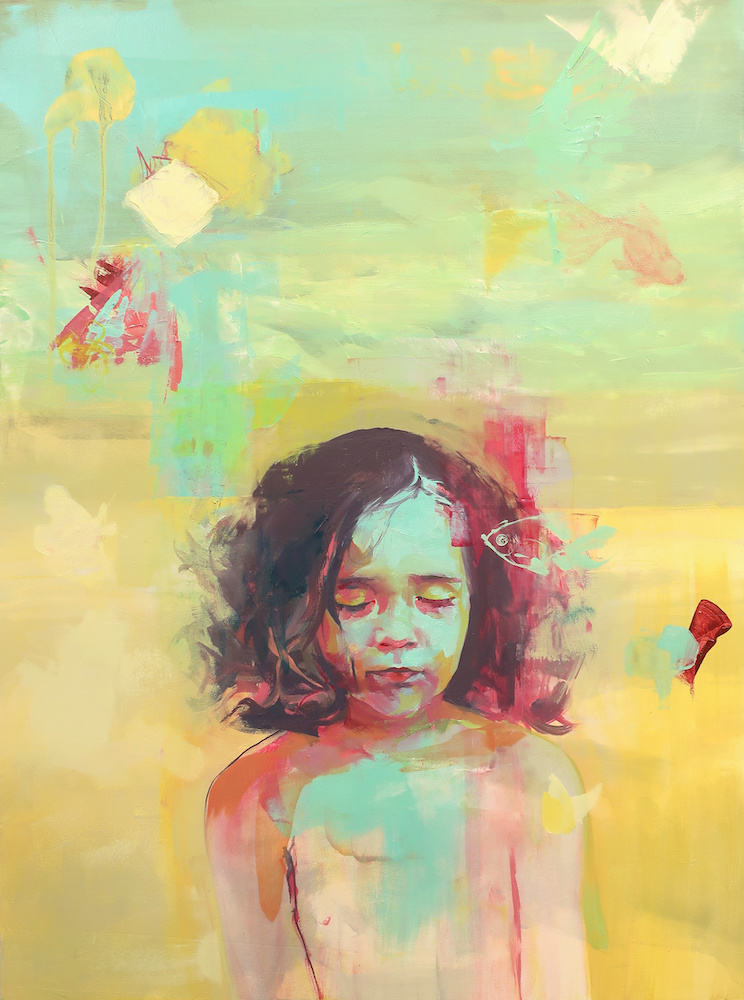 In “Fathoms” (photo at top) a girl in a bathing suit wades in knee-deep water as glowing lights dance in the air above. It’s a lovely painting, but it’s no glamor portrait. The girl’s head is awkwardly cropped out of the frame and the vantage point is of someone standing on the shore—the subject clearly not aware of whoever may be watching. The subtlety of this perspective gives the artwork an off-kilter sensation where the girl is not the focus one might expect. Instead the viewer is left to complete a penciled-in narrative with only the slightest of details available.