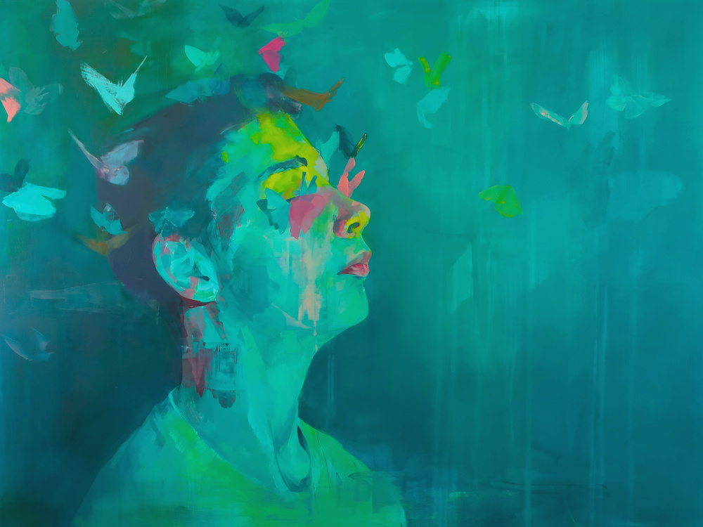 At the center of the oil painting is a woman’s face in ashen pale blues. Her expression is neutral—one could read anything from bored to sad, sleepy, desperate, or haunted into it. The woman’s eyes, though—enlarged, swirling balls of red—make her look transfixed, hypnotized, zombiefied.