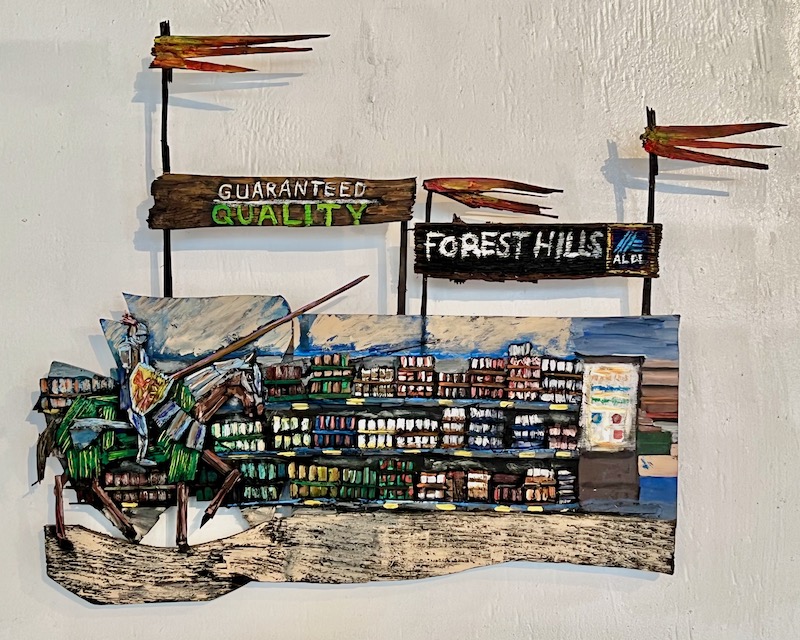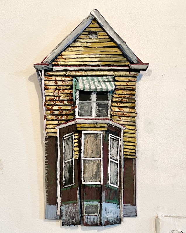 The pieces are literally rough—built on irregularly sized wooden boards with chips of rough cedar glued into place to approximate wood siding and stone, crumpled metal and bushy trees. The Orbit‘s photographs included here—or any photographs of Van Patter’s work—won’t do the 3-D elements justice, so we encourage the reader to see them IRL. (More about that below.)