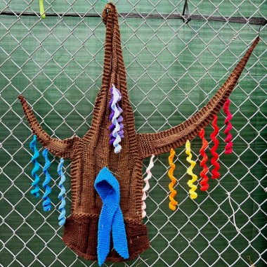 Delli Speers – rainbow turkey Published September 1, 2023 at 800 × 800 Tree by Delli Speers fiber art tree with colored streamers attached to chain link fence