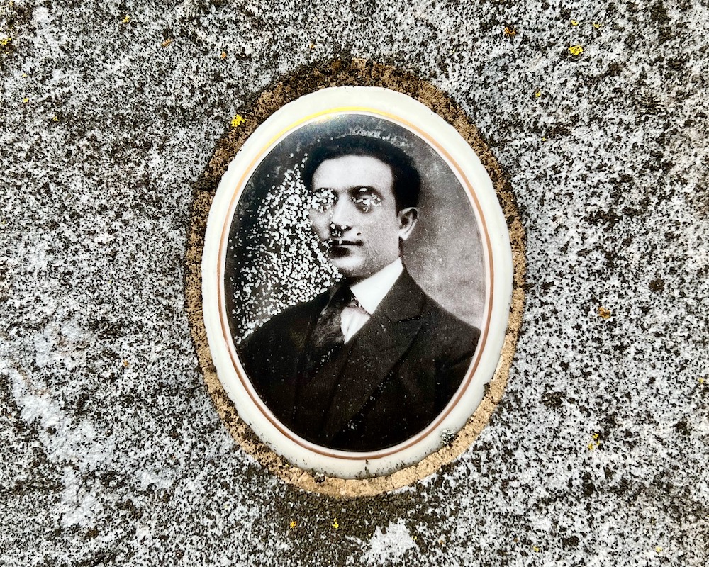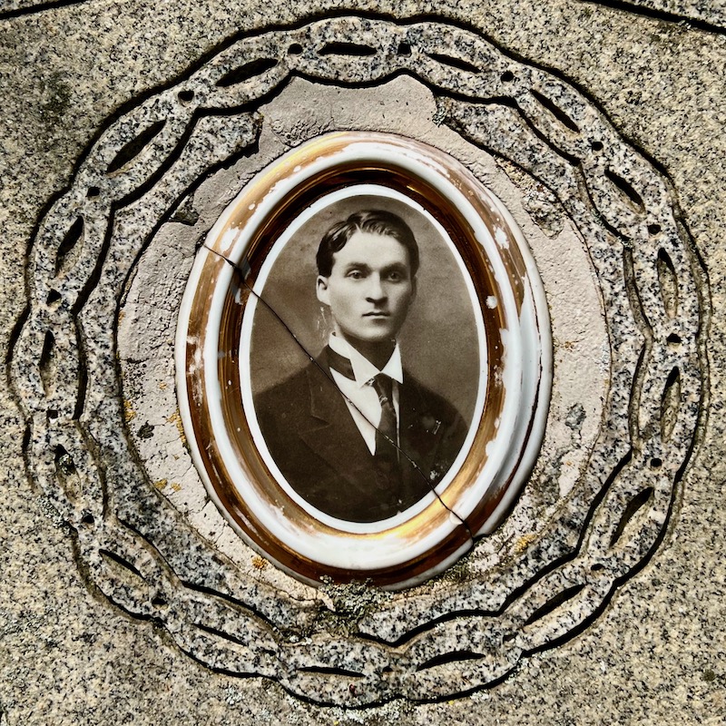 Suddenly aware and on the lookout for more, the grave photos are all over–on stones tall and thin, mounted below marble crosses and flat on granite. There may be a couple dozen in total, scattered across the sections closest to Loretto’s entry gate on Devlin Street. At least as many feature an empty cutaway in the stone where the inset image is no longer present; its former tenant stolen or broken, weathered or vandalized long ago.