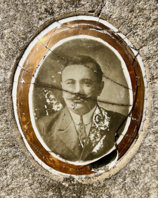 Looking around a little closer now, another headstone is embedded with the same kind of oval-shaped photo just steps away. This one features a large man in suit and tie, his head is cocked and he wears a kind of bushy mustache that hasn’t been in vogue for a very long time. Both the deep black of his dress jacket and the shade of the photo’s backdrop have worn away significantly. There’s an angled crack through the ceramic just under the deceased’s chin suggesting a sinister garrote, but the man’s face is calm–bored, even–and remarkably untouched by the hands of time.
