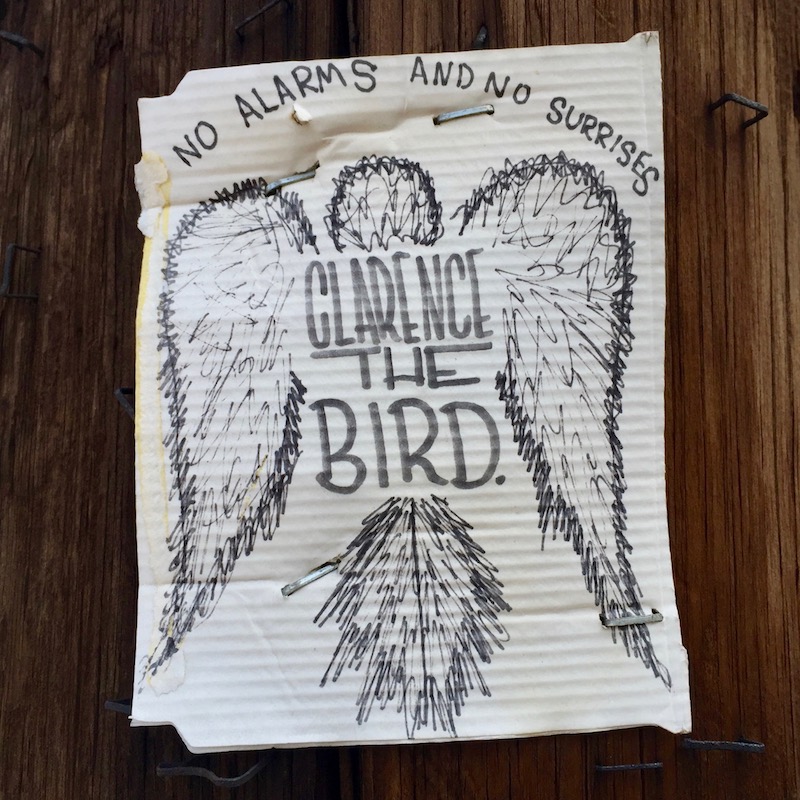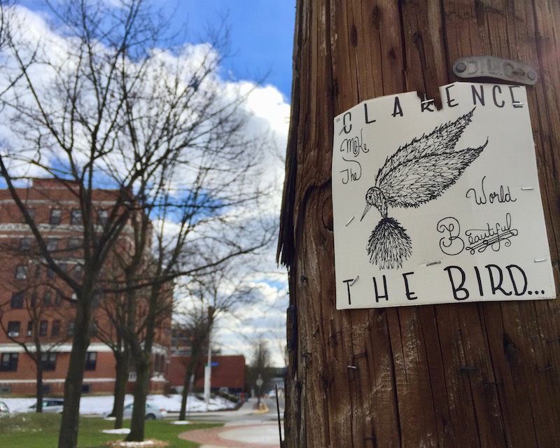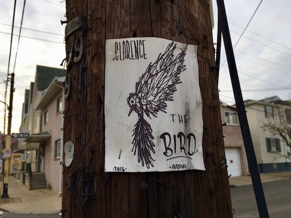 With Clarence the Bird, the egg hunt changes parameters. Like picking up pawpaws, where there’s one of his handmade, ink-on-cardboard Make the World Beautiful instances, there tend to be a lot. Find a Clarence and you can safely spread out–looking up and down at the adjacent-blocks’ neighboring telephone poles and bulletin boards–and you’ll likely spot more.