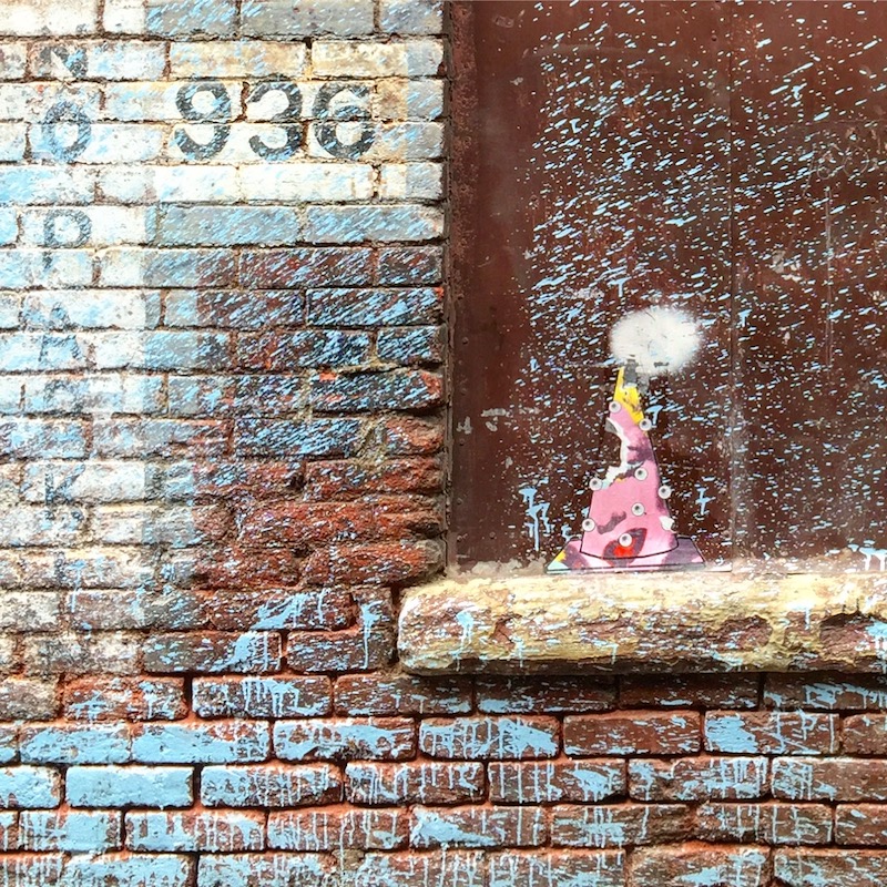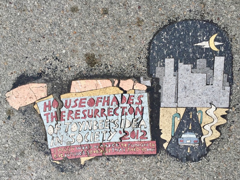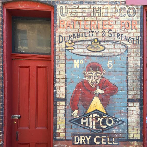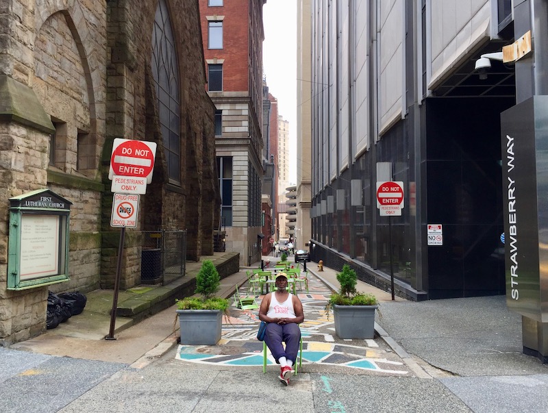 Starting maybe ten years ago, the long, lower block of Strawberry between Smithfield and Liberty started getting dressed up with temporary art installations. More recently, the city went all-in on Strawberry’s conversion from car-friendly alley to pedestrian hang-out zone. Currently, there are two blocks entirely closed-off to traffic, including the short stretch from Grant to William Penn Place where the Hardys dash down in a shortcut to intercept The Strangler on William Penn Place. These are nicely appointed with colorful street painting, tables and chairs, potted plants, and special lighted signage.