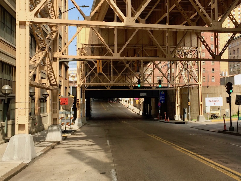 The cagey quality of 1920s-era steel girders with its heavy shadows and rumble from auto traffic above makes this space still feel like an action set–even on a quiet, sunny, Sunday morning. The steel beams appear to have been newly-painted, parking rates have gone up, and the bail bondsman (just out-of-frame) is open for business 24-hours.