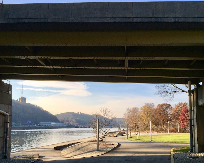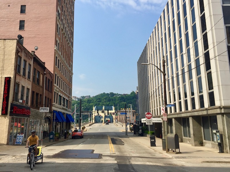 On the other side of these buildings, every cyclist will tell you Smithfield Street Bridge is the gateway to South Side bicycle-riding as the easiest, farthest, western-most entrance to the Great Allegheny Passage bicycle trail (which goes from here all the way to Washington, D.C.). The town end of the bridge also has a semi-new dedicated bicycle passage to connect cyclists to the Jail Trail and a brand new switchback ramp from the bridge will take you down to The Mon Wharf and Point State Park, traffic-free. [That opens…next month?] … but you can’t see any of that in this picture.