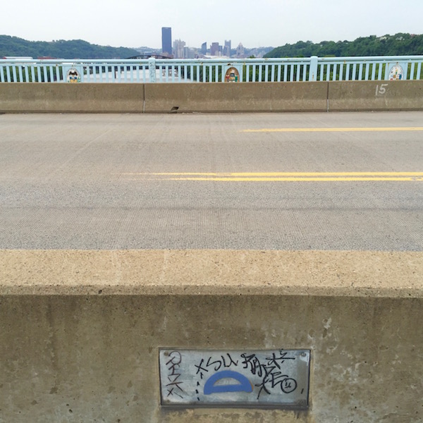 Oh, their demon powers! The perfect arc, the cosine-solving magic, the eternal urban egg hunt! Wherever we go, that’s where we are–and so are they! Attached to the low wall of a concrete pedestrian walkway, stuck to the base of a lamp pole, glued to a park bench, painted red and white on a Polish Hill mailbox. Like the protagonist of any decent jewel heist flick, just when this blogger thought he was out, the Pittsburgh protractors held a dear family member hostage, blackmailing him back to the game for one last score.