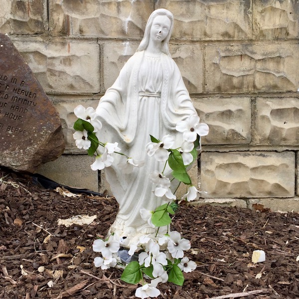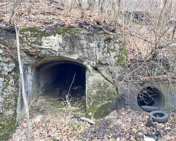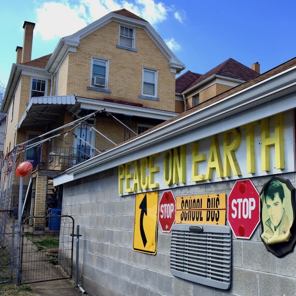 Esplen is a tiny neighborhood–among the smallest in the city both in acreage and population–but it still has a bunch of our favorite Pittsburgh things. There is a fine pair of front yard Marys at two different Oregon Street houses, some rugged untamed hillsides–one with a couple weird tunnels (storm drains from uphill Sheraden? former sewers?)–and a set of houses built on the face of a rock wall so steep there are two flights of steps to get to the front doors. A hand-painted sign informed us the mail is delivered milkman-style via the Caledonia Way alley behind the houses.