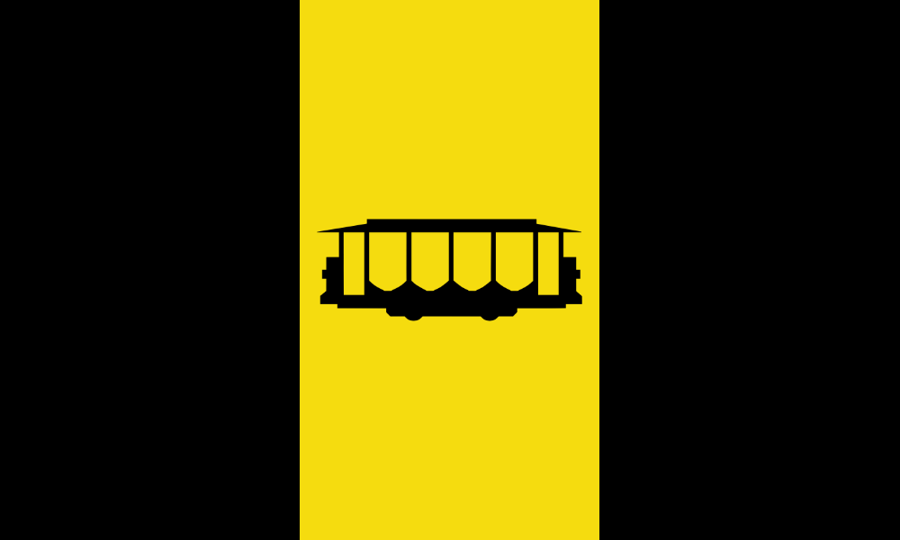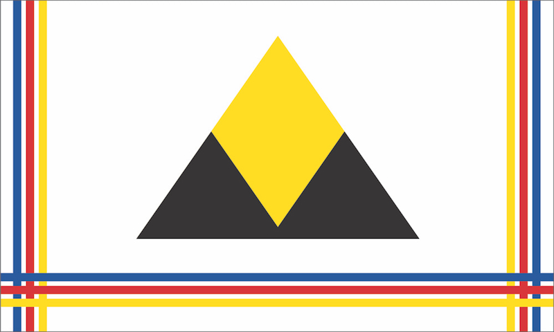 “A flag incorporating the traditional Pittsburgh black and gold. The area of the flag is split into three sections, reflecting the way the three rivers split the real city. These divisions also represent the past/our steelmaking heritage (black), the present golden triangle (the golden triangle), and our blank-canvas future (white).”