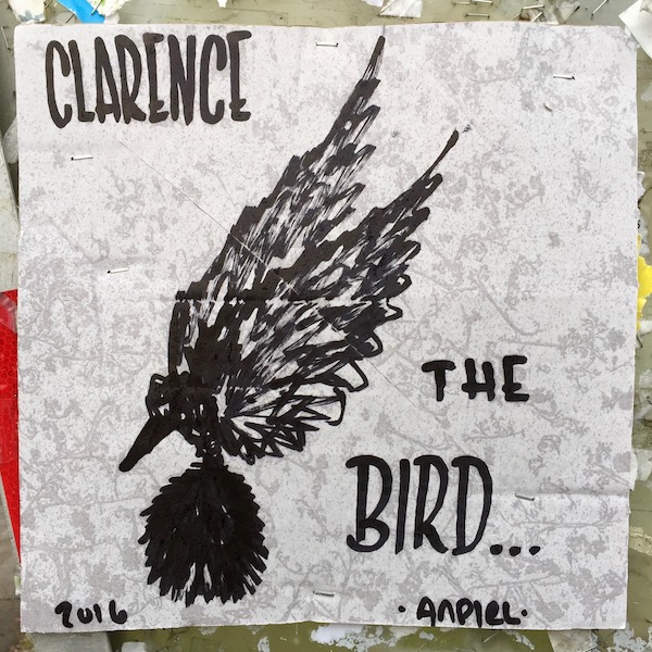 So it’s a right fine unexpected treat to spot the friendly face and outstretched, oversized wings of Clarence the Bird peering back at you as a fellow makes his or her rounds throughout the day. There he is, tacked to a telephone pole on a residential throughway and mingling with the high-minded street art on Penn Avenue.