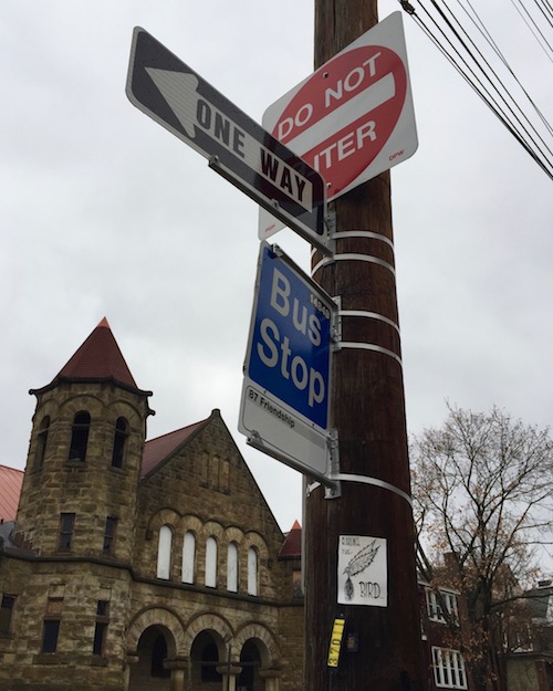 The last time we crossed paths with Mr. The Bird he was urging us to Make the World Beautiful in three of four consecutive Butler Street telephone pole hang-outs. After migrating up the hill to greater Garfield/Friendship*, Clarence seems to have both cloned himself many times over and abandoned the explicit message almost entirely. [The one photo included above is the only exception we spotted.]