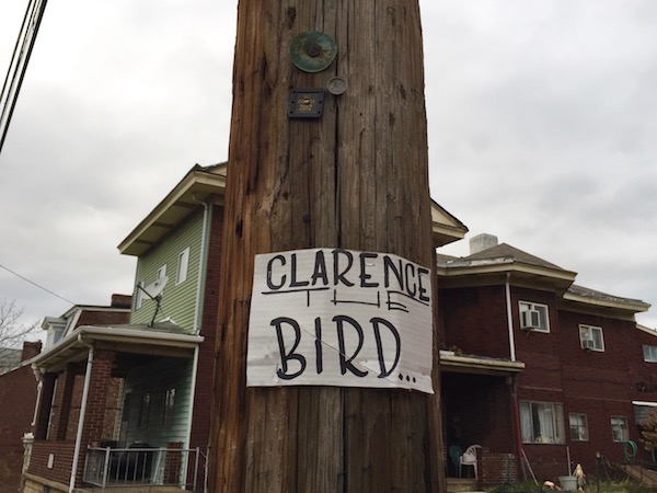 cardboard sign with the words "Clarence the Bird..." stapled to telephone pole, Pittsburgh, PA