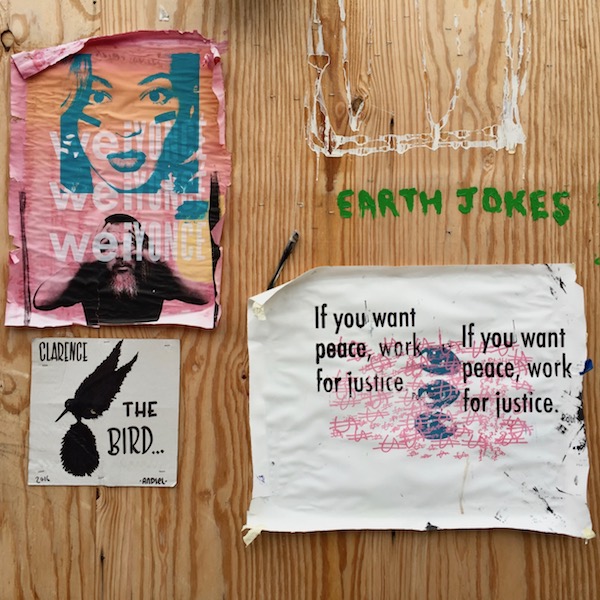 Clarence the Bird artwork among collage on empty storefront, Pittsburgh, PA