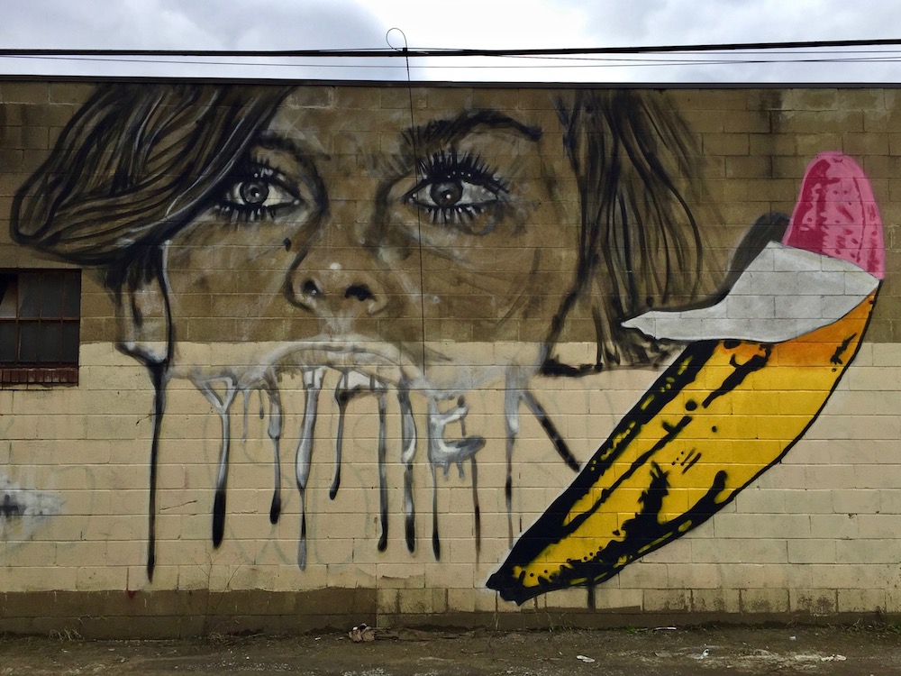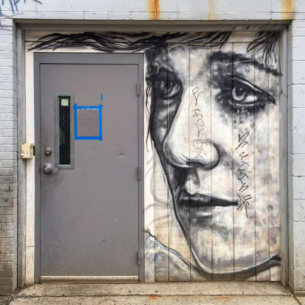 The entire thing started from the previous owner of the warehouse at 35th and Charlotte seeing me painting my house [across the street] and asking if I wanted to paint on his warehouse. I said yes and started covering the [35th Street] side with the heart, eyes, and Hedy Lamarr murals first, then wanting more space and moving into the [Mulberry Way] alley.