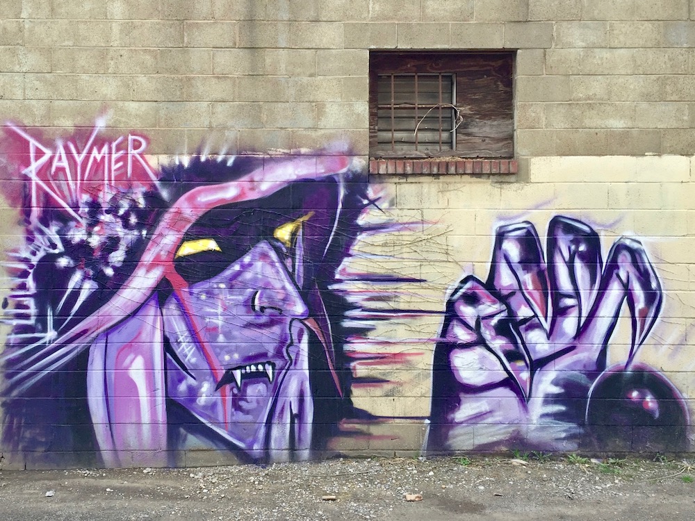 Raymer’s murals fall clearly in the world of pop art. They’re big, over-saturated with electric color, using spray paint–the medium of choice for street art–that often has a certain airbrushed quality, and focus on subject matter around celebrity, movie characters, cartoons, and visual puns. He also has a particular affinity for the color purple.