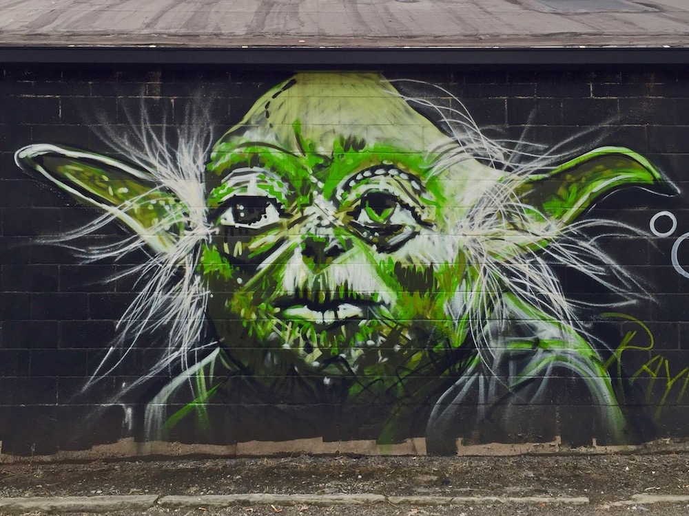 Now, I’ll be the first to say I don’t love all of Raymer’s murals. Do we really need wall-sized portraits of the green Ghostbusters slime monster, Simpsons characters, or–sorry, Star Wars fans–Yoda? A matched pair of Buffalo chicken wings with a halo is kind of funny … kind of.