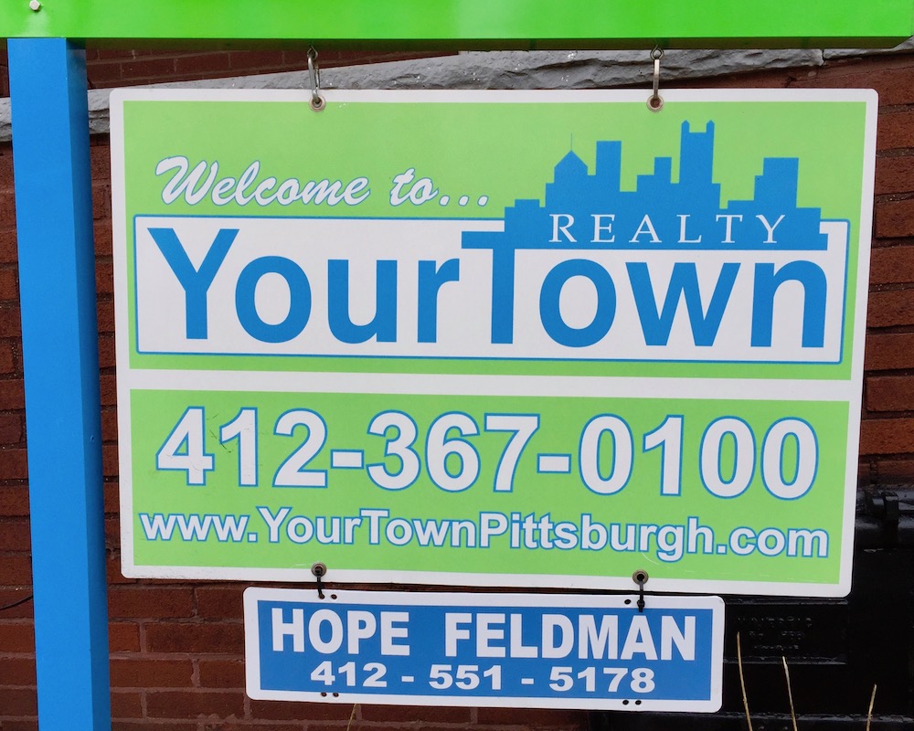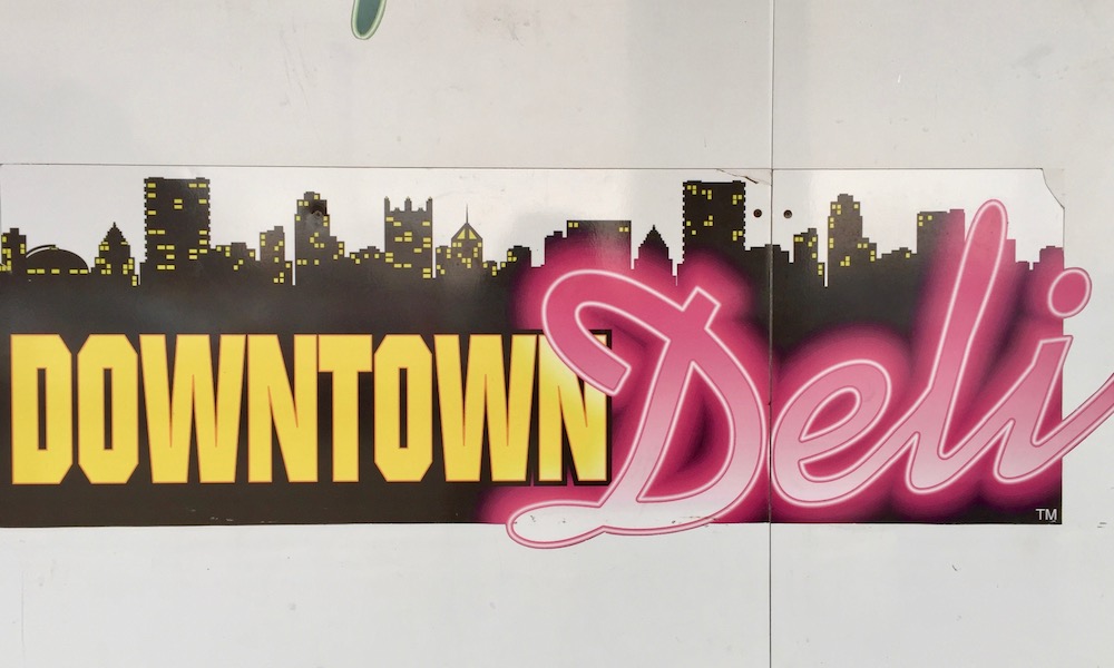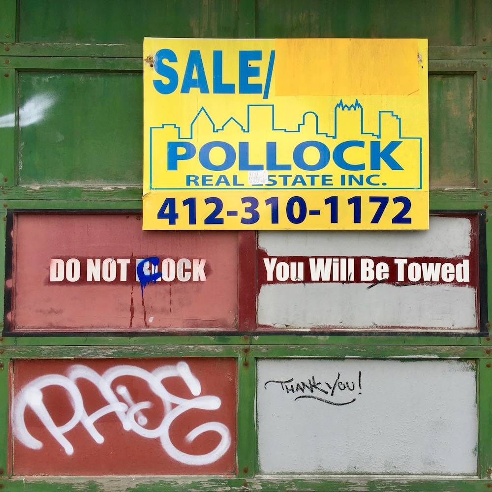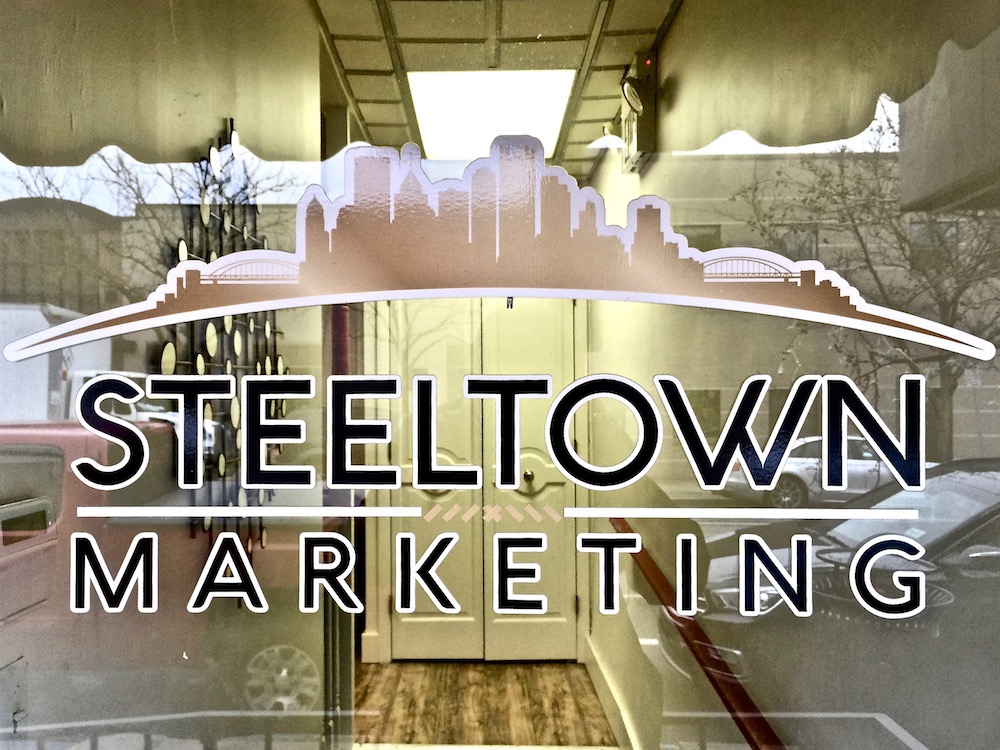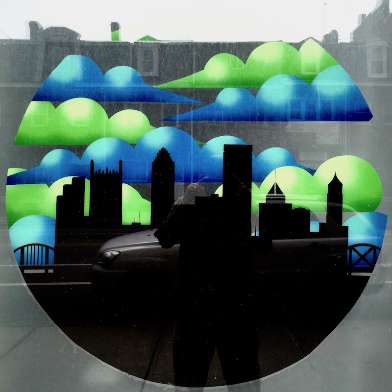 Über-stylized green and blue bubblegum clouds hover over downtown, appearing in crisp black silhouette in the wordless logo for an unknown Bloomfield business. This one is interesting in that we’re looking at town from the Hill District, facing west (with PPG on the left hand side) or the installers just chose to place the image on the inside of the office’s glass window making their customers see the inverse. If that’s the case, somebody goofed. Maybe that’s why this business isn’t around any more.