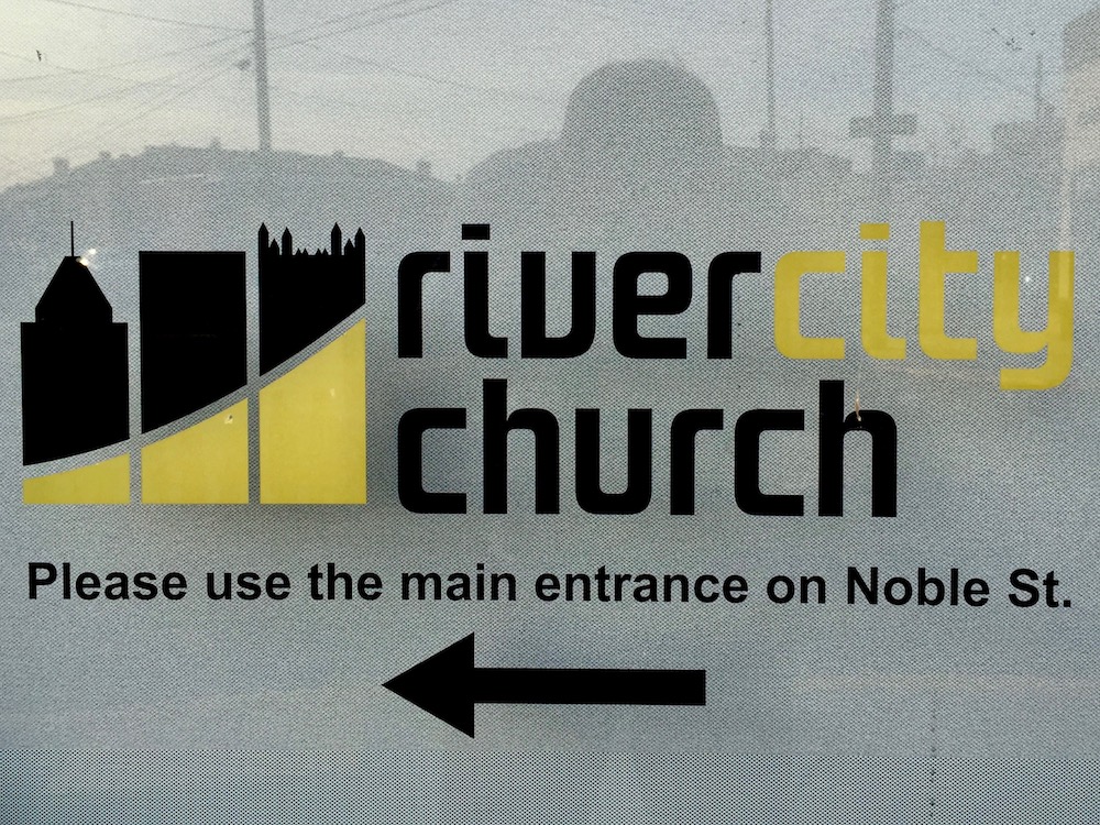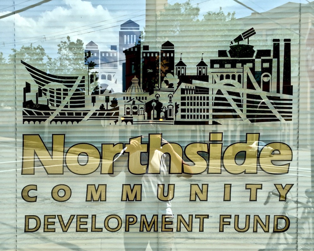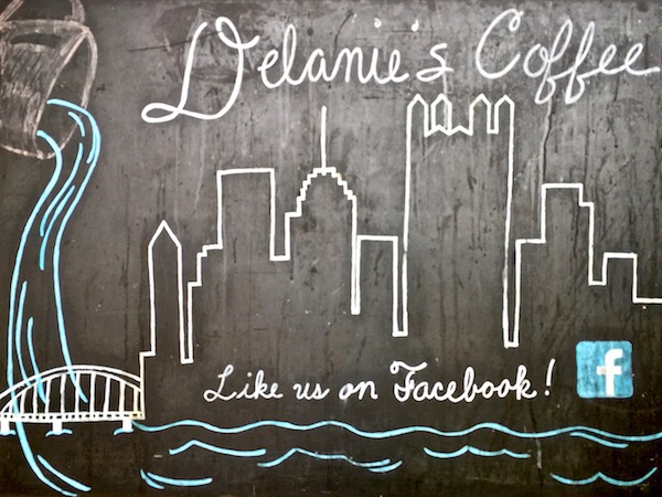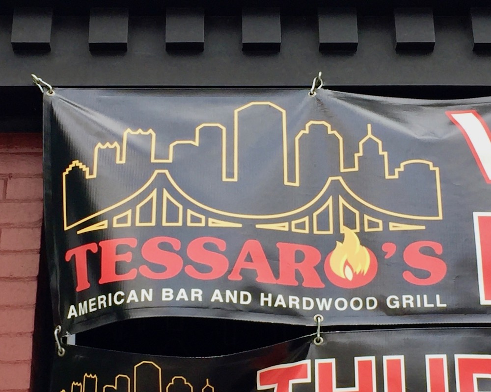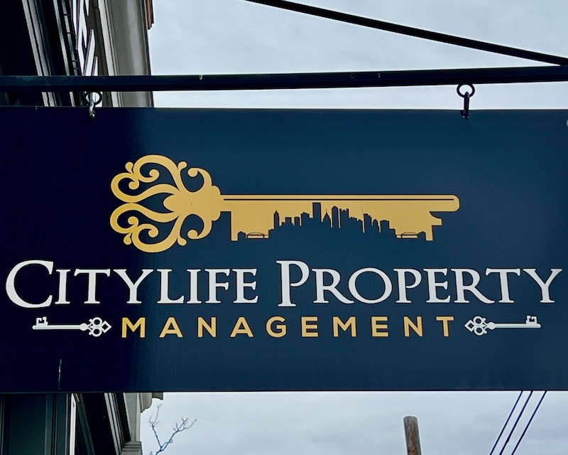 Über-stylized green and blue bubblegum clouds hover over downtown, appearing in crisp black silhouette in the wordless logo for an unknown Bloomfield business. This one is interesting in that we’re looking at town from the Hill District, facing west (with PPG on the left hand side) or the installers just chose to place the image on the inside of the office’s glass window making their customers see the inverse. If that’s the case, somebody goofed. Maybe that’s why this business isn’t around any more.