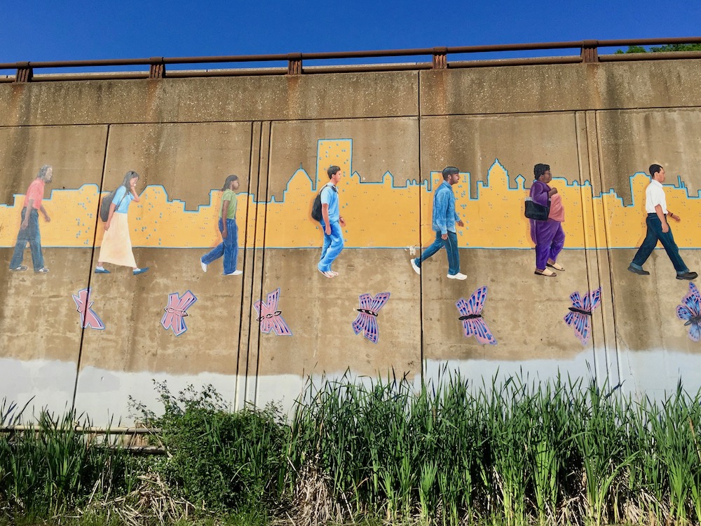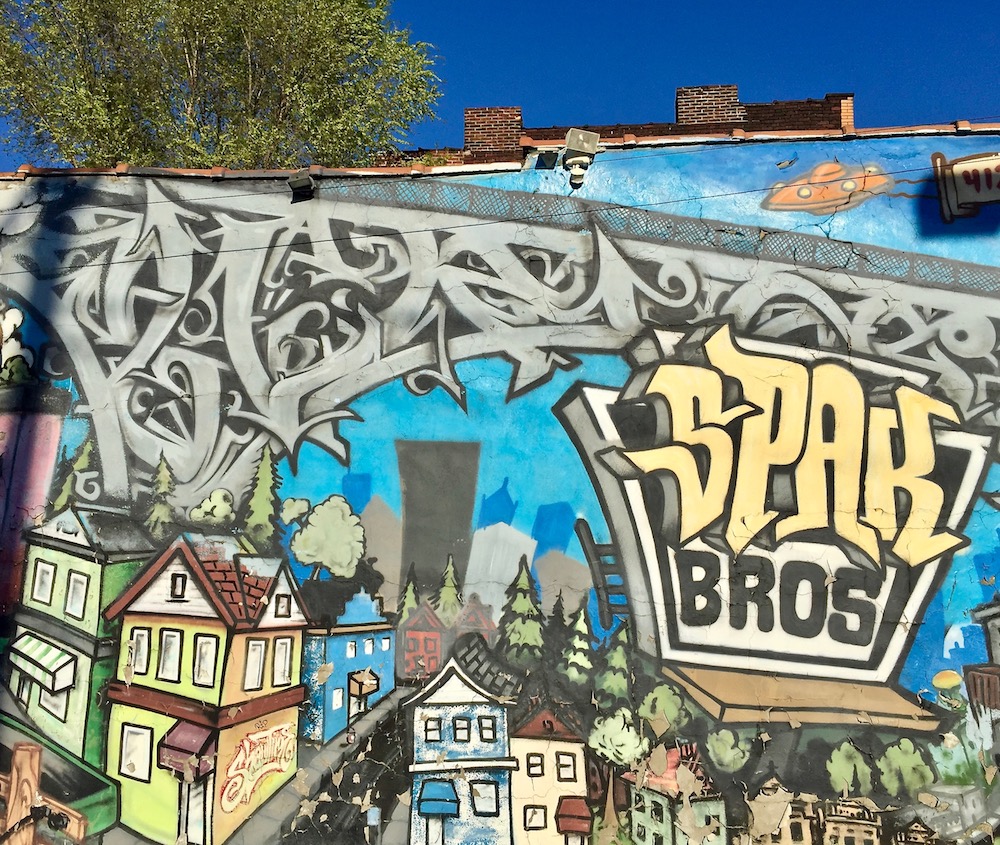 You’ve been past this one a zillion times, but it may never have registered. Heck–this blogger circumnavigated the whole building–an otherwise nondescript windowless warehouse on Liberty Avenue–which is decorated with a dozen similar-styled paintings, and I still can’t tell you what the damn place is.